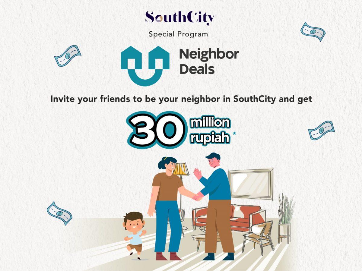 Special Program: Neighbor DealsAs a SouthCity homeowner, you deserve more than just a great place to live. With our Neighbor Deals program, you now have the exclusive opportunity to earn a 2% referral fee (up to 30 Million Rupiah!) by recommending SouthCity to your friends, colleagues, or family members.